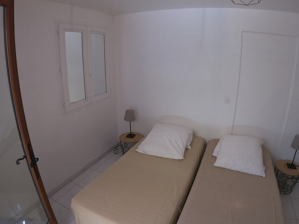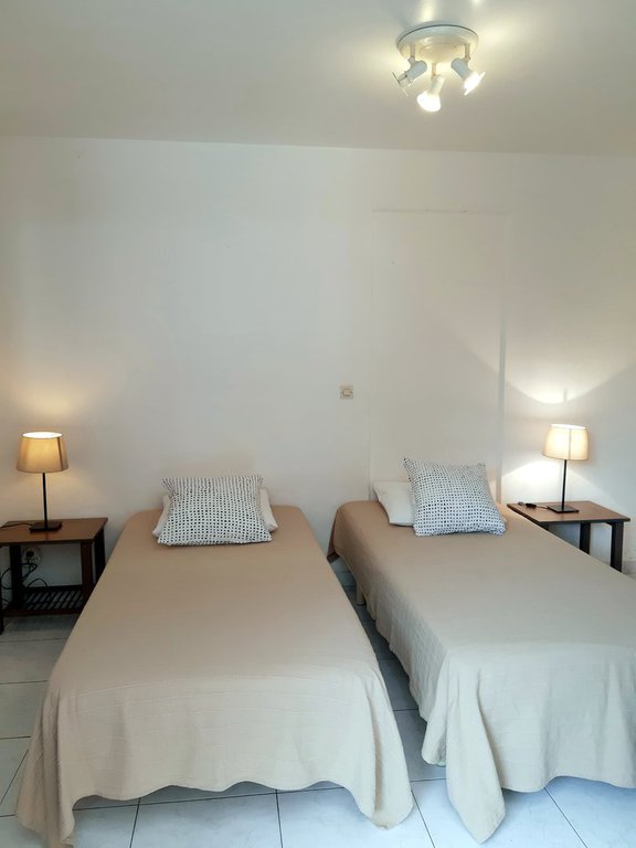D’une chambre équipée de deux lits 90x190 cm, d’oreillers, de couvertures, de tables de nuit, de lampes de chevet et d’un rangement-penderie.