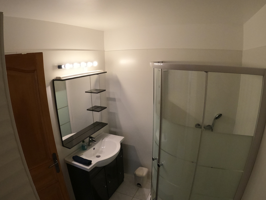 D’une salle d’eau comprenant un meuble salle-de-bains lavabo, un grand miroir, divers rangements, une cabine de douche et un W-C.