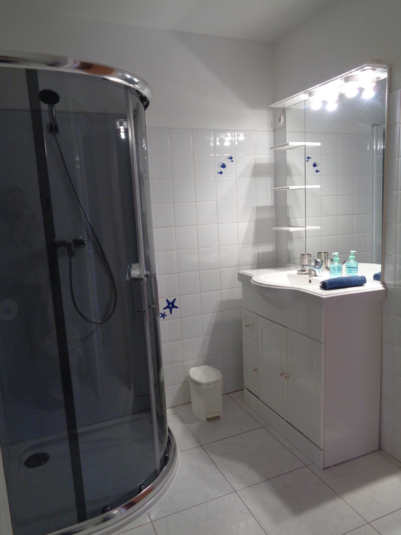 D’une salle d’eau comprenant un meuble salle-de-bains lavabo, un grand miroir, divers rangements, une cabine de douche et un W-C.